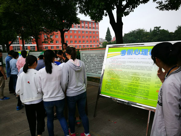 623日中午,在海安县实验高中南北大道进行了“学生考前心理调适的八大法”的专题心理宣传和“我想对自己说”的心理减压活动。