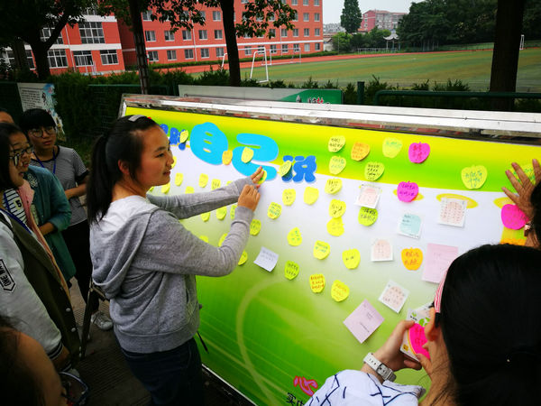 活动中,心理辅导教师与学生就考前心理困惑进行面对面交流。通过暖身活动、困惑梳理、心灵导航、放松减压等环节,让学生们放松了身心,增强了自信。活动最后,学生们积极踊跃地在“我想对自己说”留言板上留下了自己的、同学、班级和学校的良好祝愿。